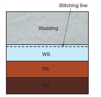 2. Coloque un segundo rollo de jalea tira derecha hacia abajo encima de la primera tira. Usando una costura 1⁄4in, Únete en el borde largo lo más cerca posible del centro del bloque. Abrir y pulse. Derecho lados juntos y coincidentes hasta los bordes, coloque una tercera tira de rollo de jalea en la cima de la segunda tira y coser en su lugar. Seguir trabajando de esta manera hasta la guata está cubierta – necesita cinco tiras. Vea la figura 1