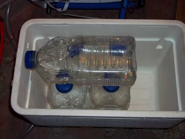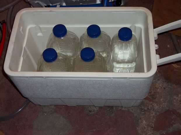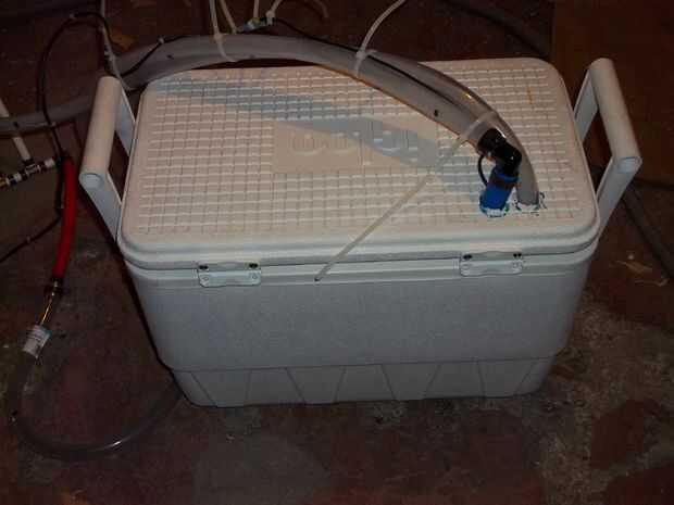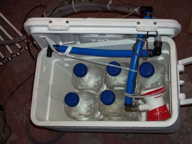 -conectar el tubo flexible a la boquilla de salida de la bomba y fijarlo según sea necesario (la bomba que tengo tiene el pezón que sale al lado, utilicé tubería de plástico para conectarse a la boquilla y luego un codo de 90 grados de plástico pex para ejecutar mi tubería verticalmente hasta la tapa de la hielera.