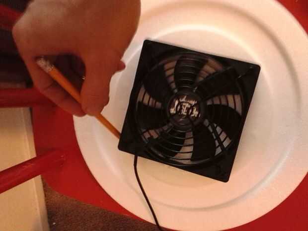 A continuación, coloque el ventilador sobre su tapa de forro de espuma cubo. Si está utilizando un ventilador de escritorio vas a descansar el ventilador encima de la tapa del cubo de espuma así que dibujar un esbozo de su ventilador y luego compensar hacia adentro sobre un cuarto de pulgada para que las hojas serán capaces de hundirse en el cubo y el labio del ventilador descansarán en la parte superior. Si está utilizando una ventilador de la CPU de la Plaza simplemente dibujar un contorno y cortar.
