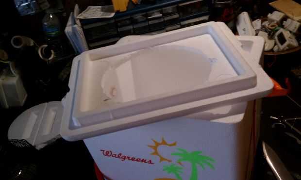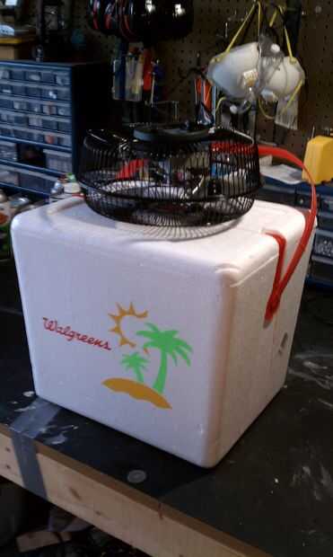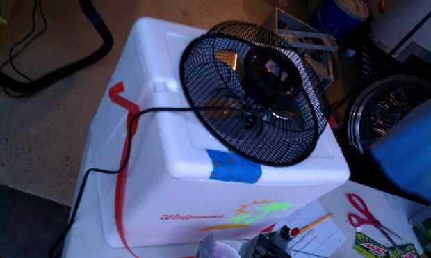 Coloque el ventilador en la tapa, comercio alrededor de él (Asegúrese de que usted cortar cómoda en su labio, no tan grande que cae un agujero bastante pequeño que el ventilador.