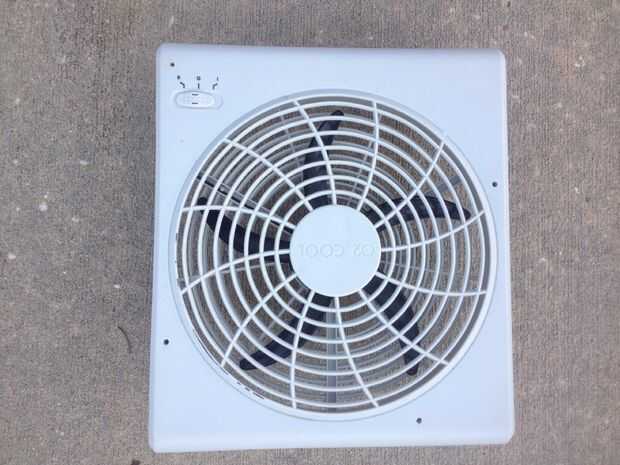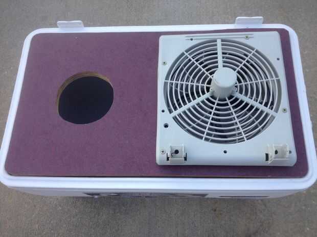 Coloque el ventilador sobre el agujero grande y taladre 4 agujeros en el ventilador. Asegúrese de que usted no perfore ningún cable al hacerlo. Usted tenga que tomar el ventilador aparte para encontrar el mejor lugar para perforar. También asegúrese de que el enchufe quede hacia la parte superior para que pueda acceder a él. Mi ventilador salió con una velocidad de dos en el interruptor. El estaba en el lado opuesto de la clavija. Puse el interruptor en lo alto y había montado el interruptor del ventilador hacia el tablero. Si quiero apagar el ventilador solo Desconecte el cable. Atornillar el ventilador a la placa. Asegúrese de que el ventilador sopla hacia el enfriador.