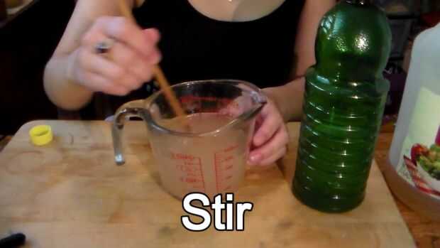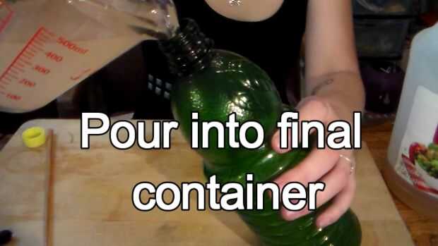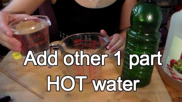 Agregue otro 1 parte de agua caliente a la mezcla. Revolver hasta que sales se disuelven. Verter en el envase final.