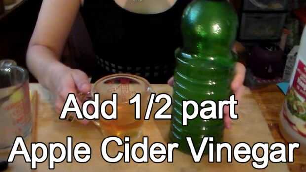Añadir el vinagre de manzana. Stir.Add 1/2 parte vinagre de manzana al recipiente final.