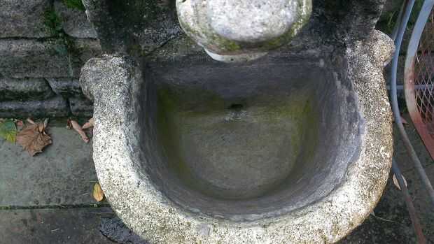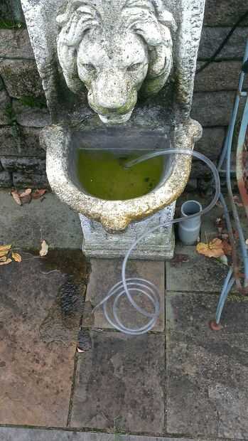 Algunas fuentes tienen tapones de drenaje, pero si no como éste, puede drenaje por inclinación o con una pequeña manguera de sifón. Esta fuente es muy pesada así que usé una manguera. Te dejo la bomba debajo de la tapa así que me atar el cable hasta mantener la bomba eleva desde el fondo.