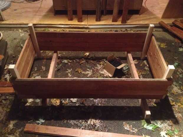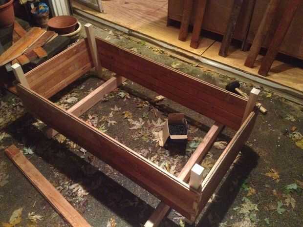 Antes de ir más lejos, quiere fijar las patas a cada esquina. Levante el marco en la parte superior de 2 x 4 en el extremo (desea unos 3,5" de la tierra), lugar 2 x 2 entradas en cada esquina y marque donde intersectan la parte inferior. También marcar los postes delanteros 2 intersección de la parte superior del marco.