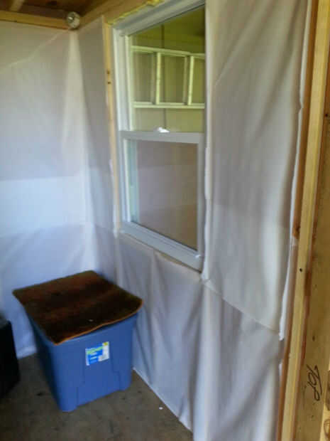 Medimos del mantel plástico para caber el espacio. Tomó 2 capas para cubrir las paredes, así que ponemos la capa inferior primero para que la parte superior se superpone. Se utilizó un staplegun para fijar a la pared. No es un sello hermético, pero maneja bien los bosquejos.