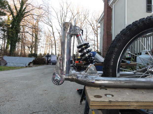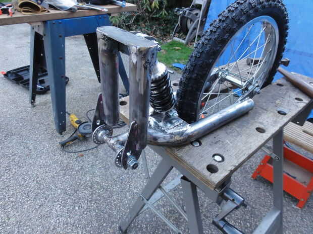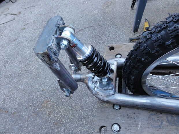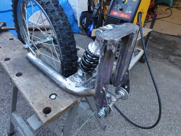 El canal fue soldada con autógena a la horquilla basculante y los montajes de choque de la parte inferior fueron soldados a la pieza del canal.