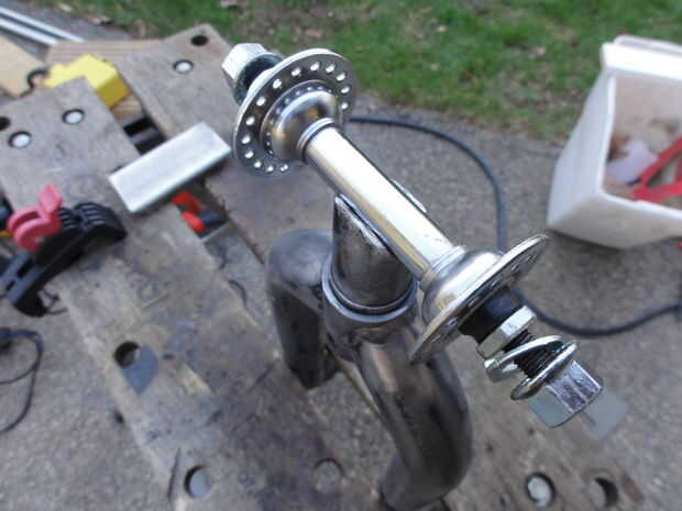 Tubo de la horquilla fue reducido y fue tierra de un surco redondeado en el extremo para recibir el acero hub/pivote. Puesto que el diámetro del tubo de horquilla era mayor que el cubo, también martillado el para un mejor tamaño del surco para el cubo encajar en el tubo de la horquilla.