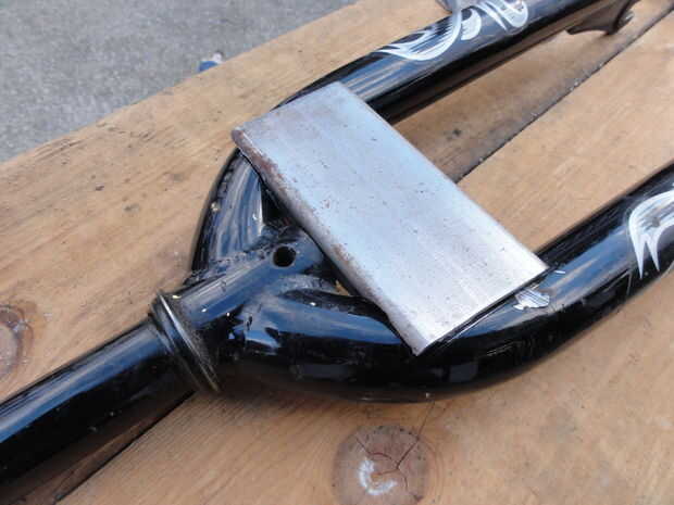El eje de acero fue soldada con autógena con el tubo de horquilla basculante. (El eje y los cojinetes fueron quitados primero.)