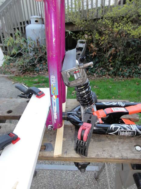 Yo corte dos montajes de choque más para la parte superior y se burló hasta el triángulo trasero. Utilicé otra bifurcación de la bici para las piernas vertical del triángulo trasero y había colocado el eje de acero de la horquilla como el pivote para el basculante. El ángulo de acero con abrazadera para el montaje de choque superior en la foto se utilizó para marcar la longitud de la horquilla vertical para cortar la horquilla hacia abajo y fue usado para atar los montajes de choque a la horquilla vertical.