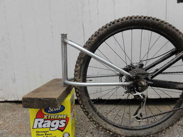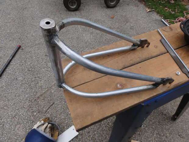 El marco de la horquilla del remolque se hizo con longitudes de 1/2 EMT doblado usando un doblador de EMT. Los largueros se ranuran con un disco abrasivo en la amoladora 4" antes de ser soldadas a las punteras. Los dos miembros del marco de la horquilla del inferior fueron primero soldado con autógena a las punteras y después soldado con autógena del tubo de pivote. Luego los largueros superior del dos tenedor eran soldados a la deserción y el tubo de pivote.