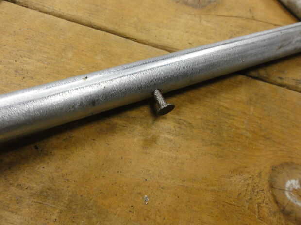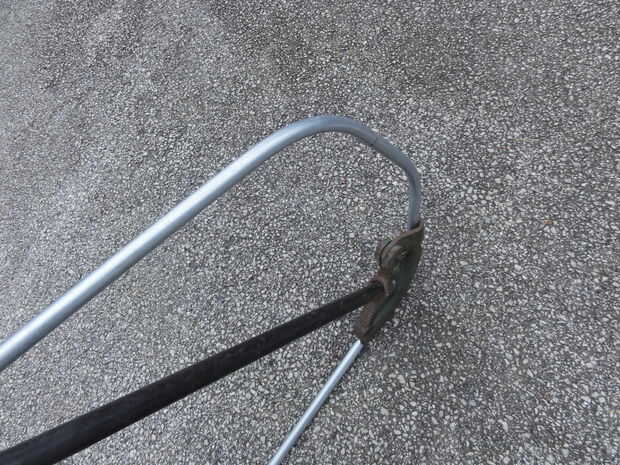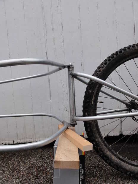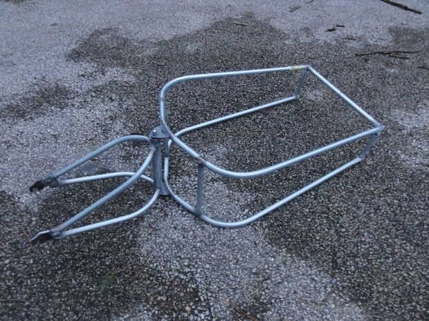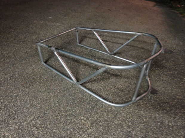 Después de otra maqueta para determinar la longitud de la trama deseada, he decidido que funcionaría a un larguero superior sobre el ángulo de acero en la parte superior del triángulo trasero horquilla vertical. I soldar al travesaño superior en la parte posterior, cortar los rieles laterales y soldar los refuerzos verticales en las esquinas posteriores.