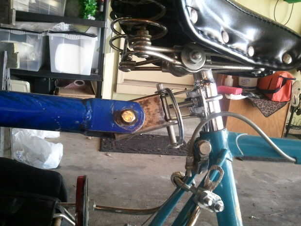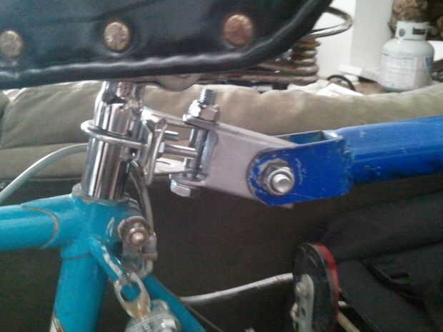 El soporte de la tija de sillín es de un echador de la rueda fija sin la rueda en él. Utilicé un solo perno en u para sujetar a la tija de sillín - usando 2 pernos u habría eliminado algunos slop que encontré más adelante.