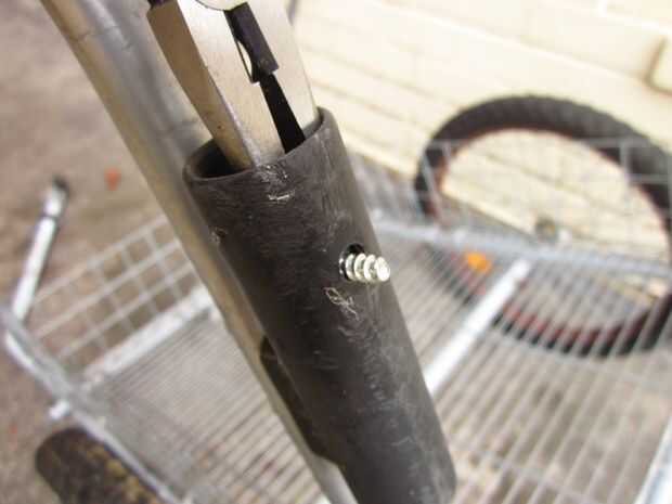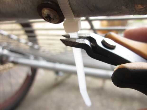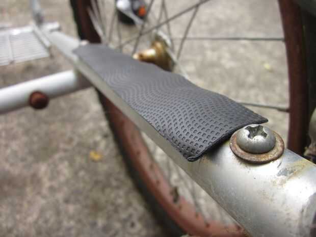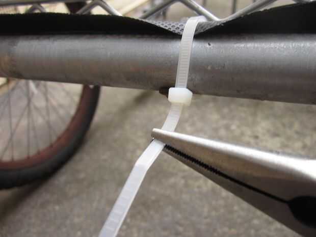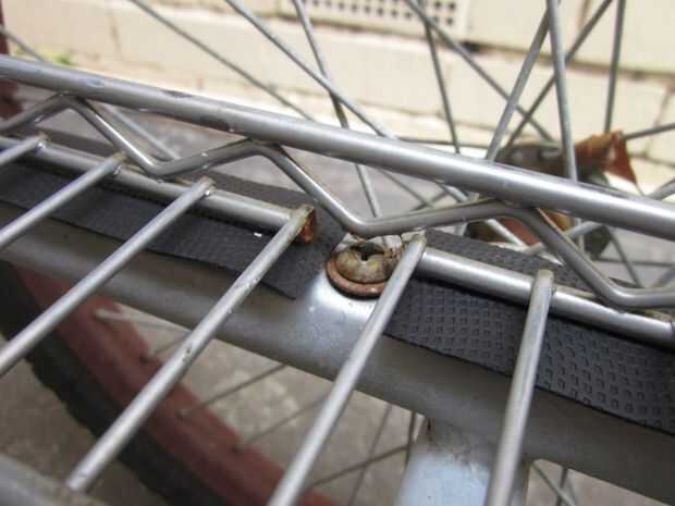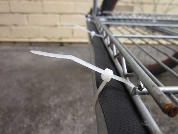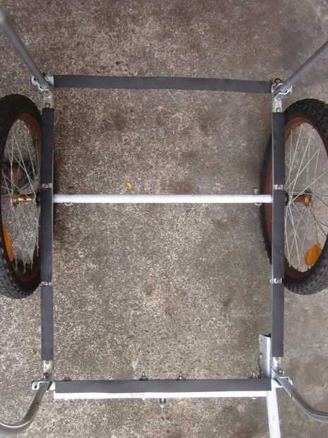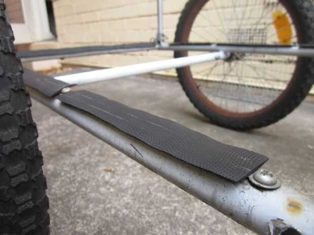 Una vez que se quedan con la columna vertebral del trailer del próximo paso es construir una caja. Supongo que hay varias formas de hacer esto, pero he optado por una especie de jaula de mirada, como pensé que sería ligero y ideal para usar cuerdas de amortiguador auxiliar. Tuve suerte de encontrar en la calle un marco de parrilla-como la aleación de un closet portátil que estaba sobre el tamaño correcto y robusto suficiente para crear el piso del remolque. Yo en forma de marco con una sierra para metales, cortar el exceso y retirar los cilindros en la esquina, por lo que encajaría muy bien en el remolque. Entonces usé niveles cable para garantizar el piso para el remolque. Después de unos paseos yo estaba contento con el rendimiento general del remolque pero frustrada por el ruido de golpeteo de todas las partes metálicas chocar uno contra el otro (sobre todo cuando se viaja sin ningún cargo). He quitado el piso y utiliza cinta de manillar para cubrir el armazón del remolque donde estaba sentado el piso. Esto resultó para ser una muy buena solución.