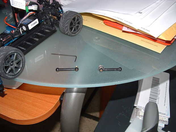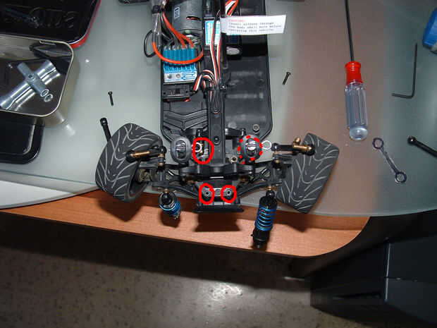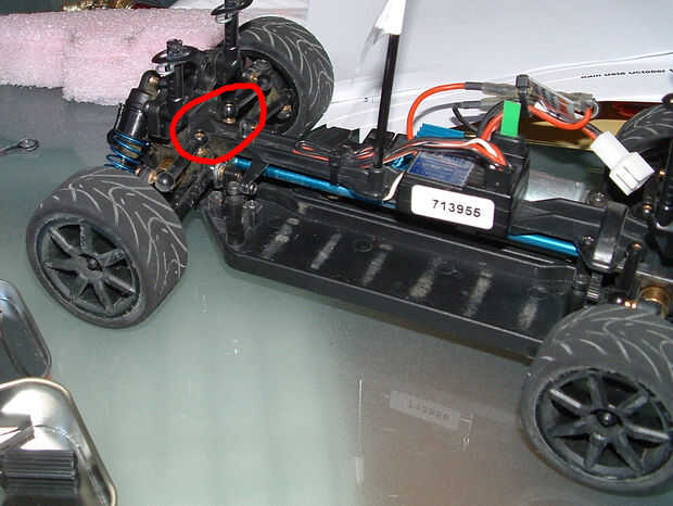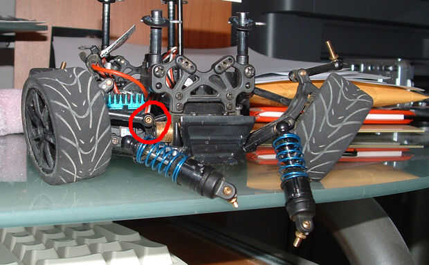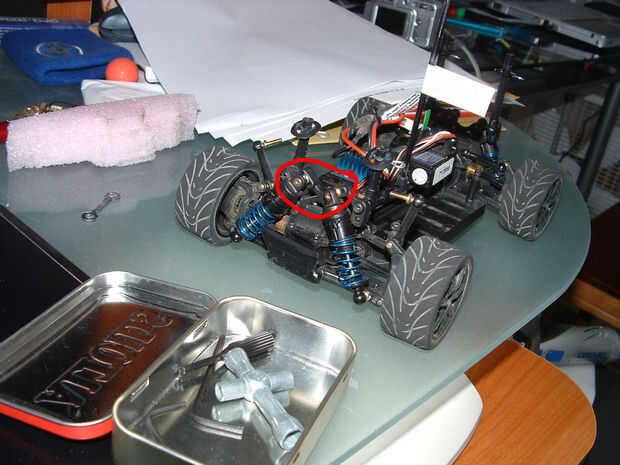 6. Levante la cubierta de la caja diferencial y deslice el acoplamiento de la fricción bajo. Deslícela sobre el dirección enlace de bola a cada lado. Asegúrese de que no toque el acoplamiento de la fricción del eje o chasis. Si, quitarlo y arreglarla.