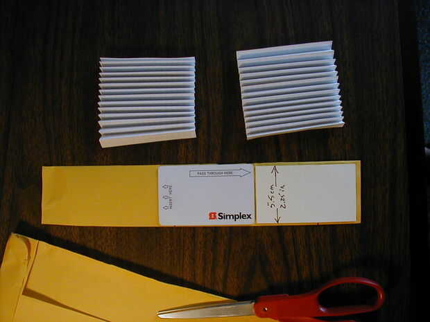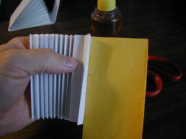 Interior: Pega la parte exterior de la aleta pasada de un acordeón y alinearse con el lado de la tapa en un extremo. Repita para el otro acordeón en el otro lado de la franja de ancho. Si es necesario, coloque una tarjeta para ser almacenado en el armario del compartimiento para el material de la cubierta para comprobar ajuste. Asegúrese de que el acordeón se "reflejan", es decir, que crear "compartimentos" simétricas entre ellos.
