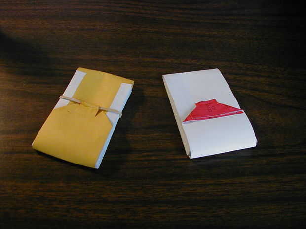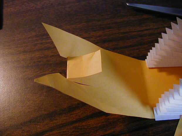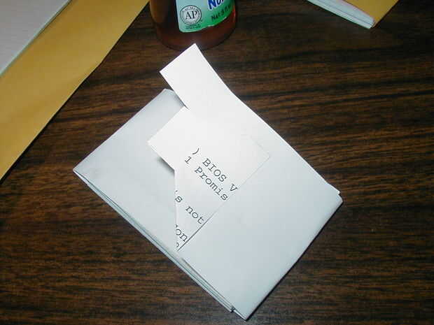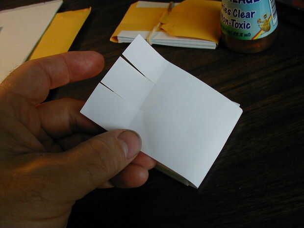 Tab: Corte una abertura en el centro del "frente", el lado cubierto por la tapa superior. En la solapa de la tapa, cortar una pestaña tan amplia como la raja y todo el camino hasta el nivel de la hendidura por debajo. Veces más y el pegamento que desean---hizo una ficha doble grueso con los lados doblados encima para algunos agregan fuerza.
