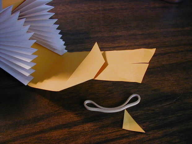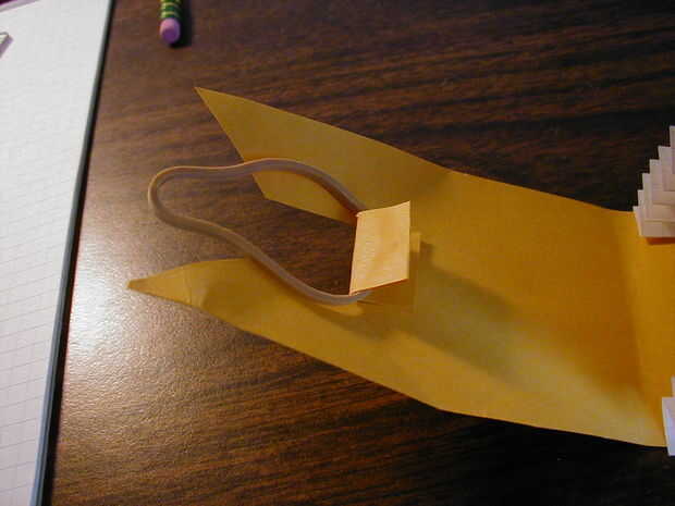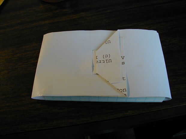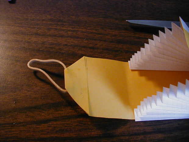 Capturó banda de goma: Encontrar una banda de caucho de fuerza de luz que apenas ceñida alrededor de la anchura de la cartera cerrada. Cortar la tapa del extremo en tercios dispositivo---cortar tal vez 1/3 de la longitud de la tapa (corte hasta 1/2, pero creo que mejor habría sido 1/3). Doble la pestaña media mitad, pegamento a sí mismo. Doblar otra vez en medio, lugar banda de goma en el doblez y con adhesivo, captura de la banda de goma. Doblar las lengüetas laterales y cola para darle un poco más de fuerza.