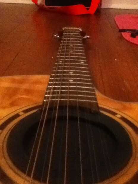 Construido un colgador de guitarra simple de un registro y unas cañas. Tengo un stand de guitarra pero ocupa espacio en el piso y con los niños corriendo no seguro ya. Tengo unos registros de colocación alrededor y cuando comprobé que estén limpios y