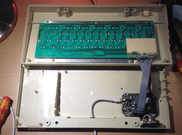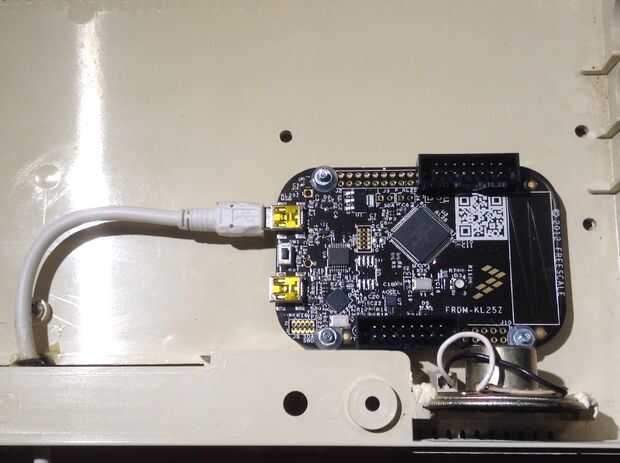Cable USB del teclado es un USB A mini-B cable conectado a la otra toma en el tablero (etiquetado 'KL25Z') a la que se que utiliza para la programación. Puede enroscarse hacia fuera a través de la ranura en la parte posterior de la moldura de minúsculas. Pegué un ojal de goma alrededor del cable en este momento a proporcionar cierto alivio de tensión.