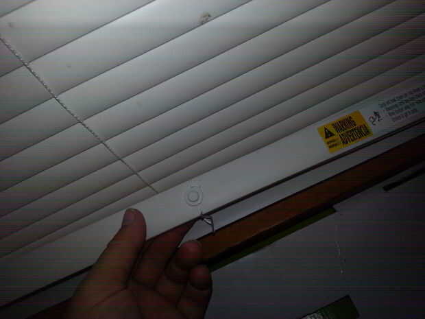 Fotos 1 y 2 - voltee la pieza inferior de la persiana, debe ver tapones poco (si usas un tipo diferente de ciegos, que no tenga, no estoy seguro). Quitar estos tapones pero aflojando los bordes suavemente con un destornillador u otro objeto plano.