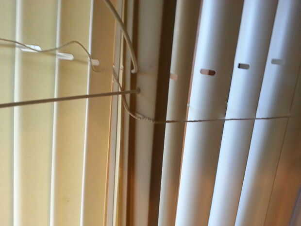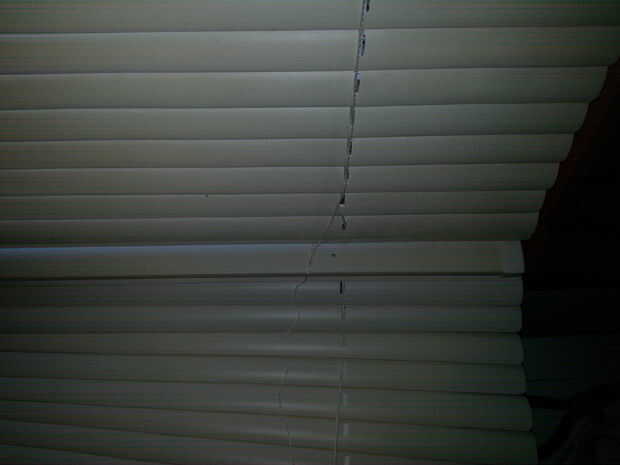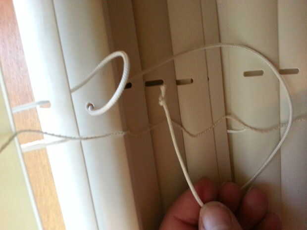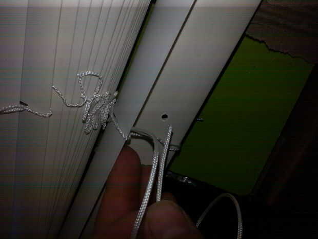 Foto 2 - meter el dedo entre las persianas que encuentra la cadena de la palanca de este lado. Me di cuenta más tarde que este paso... y los demás... sería más fáciles si abres las persianas (lo chueco). *shrug* bueno. Buscar la cadena de la palanca y tire hacia arriba a través de todas las tablillas que usted ya no se va a utilizar.