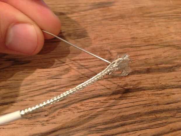 Usando el pin, su forma de arriba abajo, destejiendo el cable de trabajo. Tenga cuidado de no tratar de desentrañar más que la parte trenzada como los cables serán más difíciles de deshacer como vas. Una vez unweaved totalmente, tire para un lado y giro.
