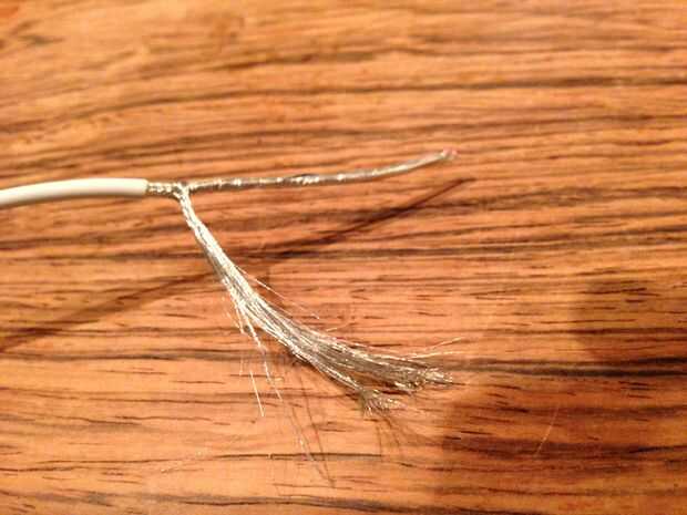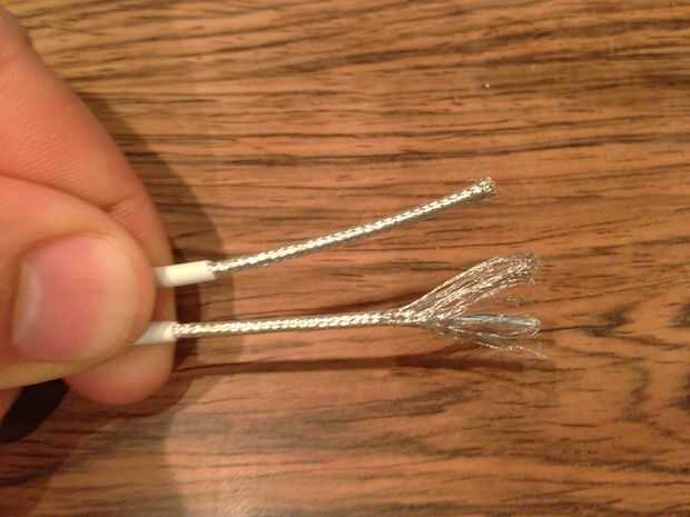 Baje el cable trenzado lejos del corte. Aflojar y ser amplio y exponer todos los cables por debajo. Este entretejido parte es sólo una capa protectora. Después de tirar de nuevo, usé sizzors cortar completamente.