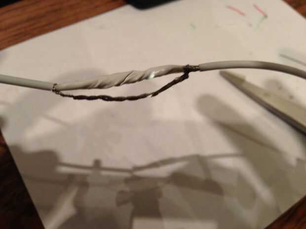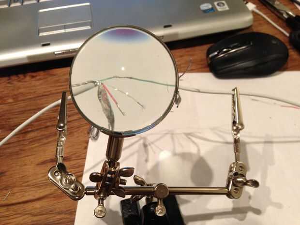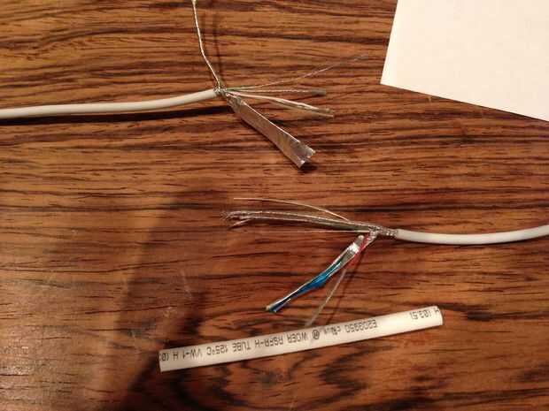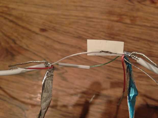 Uno de los cables interiores pelados trence, usando las manos para sujetar el cable de la soldadura. (instrucciones en soldadura en youtube). Cubre el cable con el amound menos de cinta eléctrica posible.