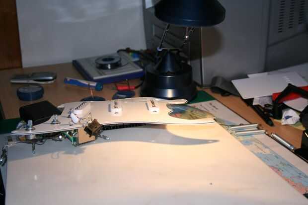 Ooh y no olvide conectar los soportes de resorte para el puente con un alambre. De lo contrario la electrónica no conectada a tierra y obtendrás algunos buzz. Por lo menos, creo que de todos modos
