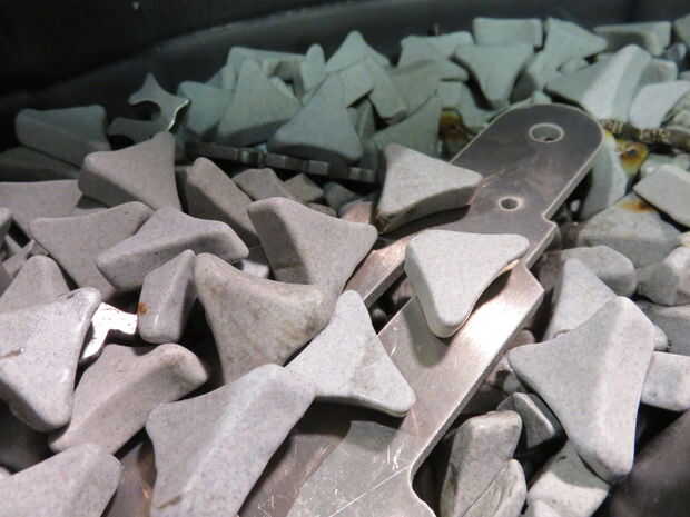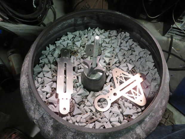 De la cortadora del laser, las piezas tienen un borde afilado. Usé mi vaso de poca confianza para derribar los bordes. Si no estás familiarizado con un vaso es básicamente un recipiente vibrante llena de un abrasivo. En este caso cayeron las partes durante la noche.