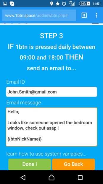 Nota: hay muchas otras variables del sistema se puede utilizar en su mensaje. Revisa la lista en el portal web de 1btn.