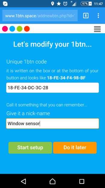 Nota cómo el 1btn obtiene un apodo significativo así que usted puede identificar mejor. Si usted planea tener tales sensores múltiples, puede darles cada nombres únicos para ayudar a mantenerlos rectos (ventana 1, ventana #2, etc.).