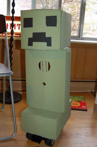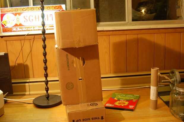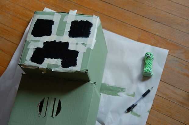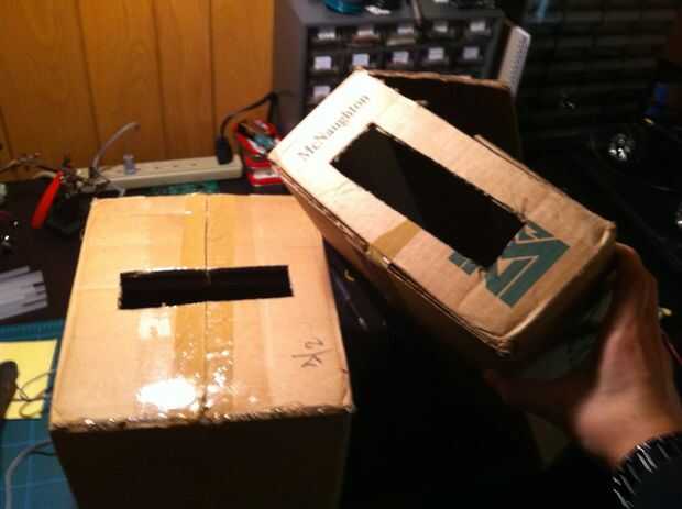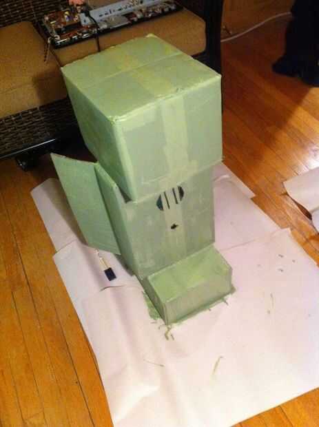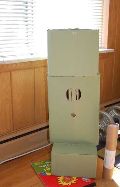 Mi primer paso fue corte agujeros para permitirme correr cables internos de la caja y abrir algunas puertas de acceso en la parte posterior de cada caja. También Corte orificios en el cuadro de abajo que me permita a bridas de rosca a través de la parte inferior y alrededor del coche RC y abrió huecos para el sensor PIR y el altavoz. Después de hecho esto conecté las tres cajas de cartón que forman el cuerpo, utilizando un pegamento resistente. Este material tire el laminado fuera de su escritorio antes de tira de cosas serias. Todo tiene una capa de pintura "Enredadera verde" y enmascarados de los ojos y la boca de una capa de "Soul-less matanza máquina negro".