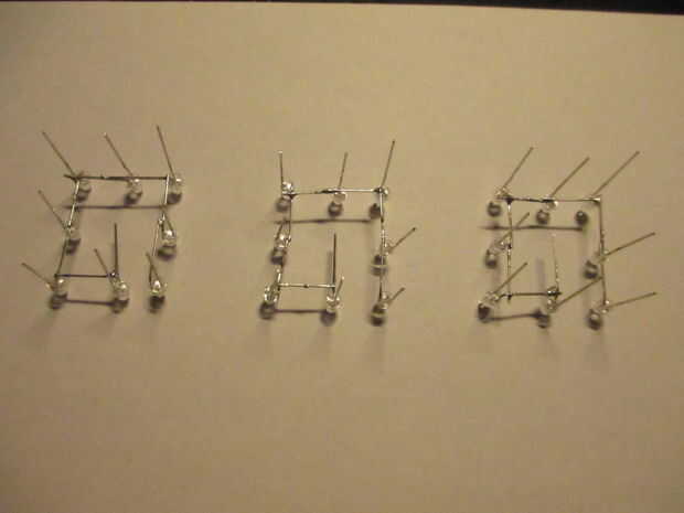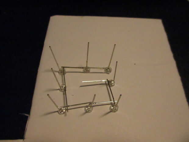 - Poner un led en cada agujero y doblar las piernas para que la pierna más larga (ánodo) está hacia arriba y la pierna más corta (cátodo) apunta hacia el led a su lado. Ver foto de referencia.
