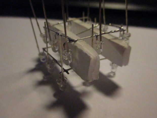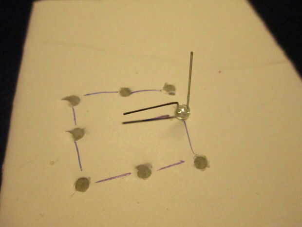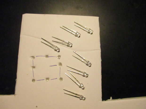 - Ocho taladros en una pieza de cartón u otro material para los leds como se muestra en la foto. Tenga en cuenta que la distancia entre dos agujeros adyacentes debe ser menor que la longitud de la pierna más corta de su LED.