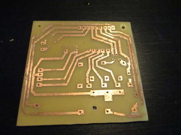 A continuación tenemos la placa, que he unido en este instructable. No tengo mucha experiencia con el águila y otros programas de diseño para la electrónica, por lo que este diseño es más o menos dibujadas a mano en Photoshop. No es muy bonito y no es muy buen diseño general, pero funciona. Las dimensiones deben ser 6 cm x 6 cm, aunque, así que ten cuidado, cuando se imprime, que la impresora no la escala. Utiliza el método de transferencia de tóner para transferir el diseño a la placa de cobre revestida y luego lo había grabado con cloruro férrico. Hay algunos grandes tutoriales en este método en internet, para que una búsqueda rápida debe ayudarle mucho si no estás familiarizado con este método.