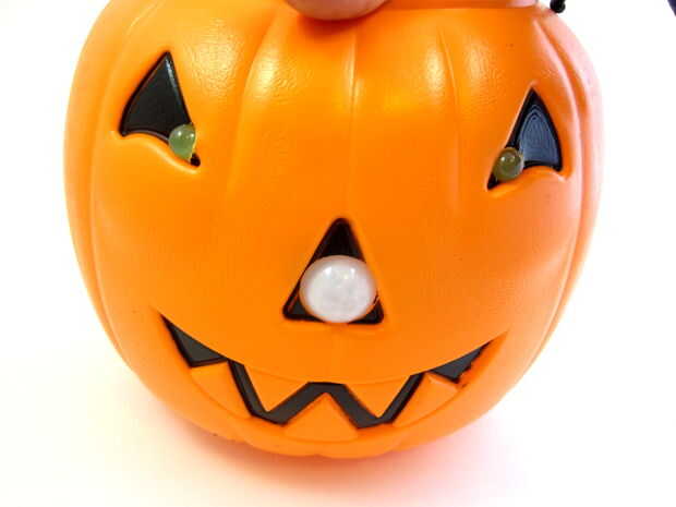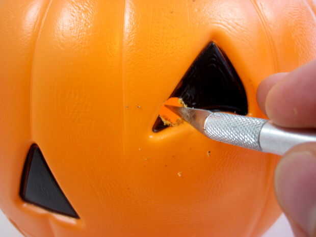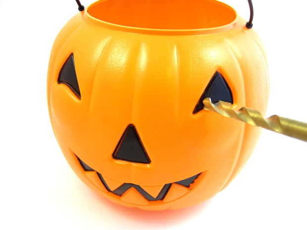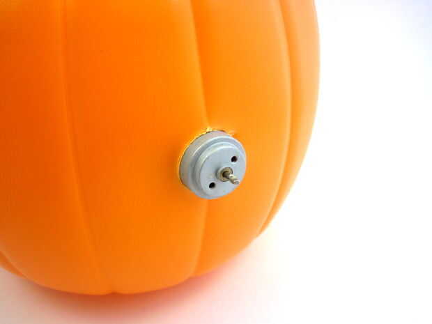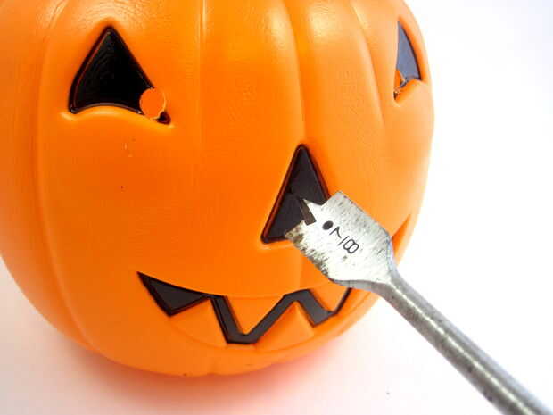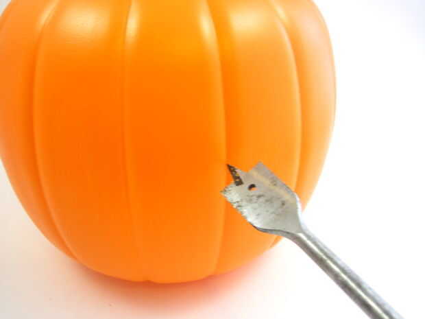 Ahora necesita perforar agujeros en la calabaza para los ojos de LED, nariz de sensor de movimiento y el motor (que va en la parte posterior). Utilice la broca de pala o sierras de perforar los agujeros para el sensor de PIR y el motor y la regular broca para perforar los agujeros para los ojos. Utilizar un cuchillo Xacto para limpiar cualquier fresas alrededor de los bordes de los agujeros.