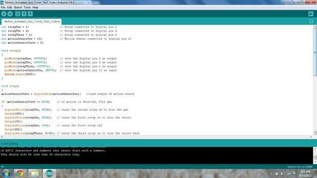 Si (motionSensorState == HIGH) / / si se detecta movimiento, arma de fuego {digitalWrite (relayTwo, HIGH); / / convierte el segundo relais para disparar la pistola delay(1000); digitalWrite (relayOne, HIGH); / / se enciende el primer relais para girar la torreta delay(150); digitalWrite (relayOne, LOW); / / se convierte el primer relais de delay(500); digitalWrite (relayThree, HIGH); / / enciende el tercer relais a volver la torreta delay(300); digitalWrite (relayThree BAJA); se convierte el tercer relais de delay(500); digitalWrite (relayOne, HIGH); se enciende el primer relais para girar la torreta delay(300); digitalWrite (relayOne, bajo); se convierte el primer relais de delay(500); digitalWrite (relayThree, HIGH); se convierte el tercer relais on para activar la torreta trasera delay(300); digitalWrite (relayThree, bajo); se convierte el tercer relais de delay(500); digitalWrite (relayTwo, bajo); se apaga el segundo relais para dejar de disparar el arma digitalWrite (relayOne, HIGH); se enciende el primer relais para girar la torreta hasta delay(700) de un lado; digitalWrite (relayOne, bajo); se convierte el primer relais de delay(500); digitalWrite (relayThree, HIGH); se convierte el tercer relais on para activar la torreta hacia la delay(425) de la posición de centro; digitalWrite (relayThree, bajo); se convierte el tercer relais de delay(1000); }