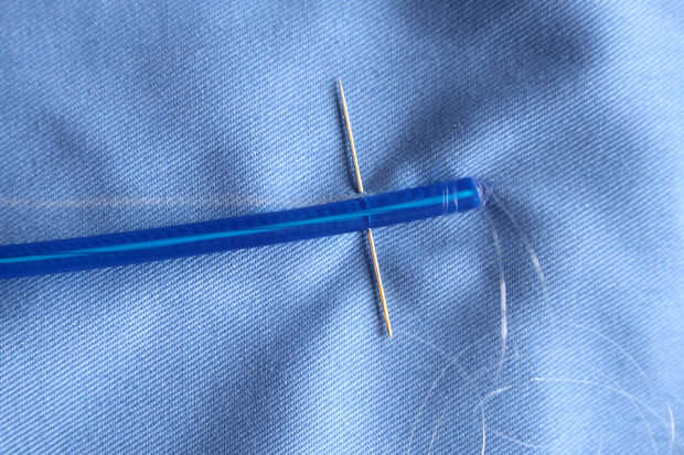 Es la forma más sencilla de conectar EL alambre coser sobre el uso de hilo transparente (hilo de rosca coloreado bloqueará la luz). Sujeta el extremo del cable EL con algun pegamento caliente antes de coser para que sea más fácil trabajar con. También usé longitudes relativamente cortas de hilo, ya que enrede muy fácilmente.