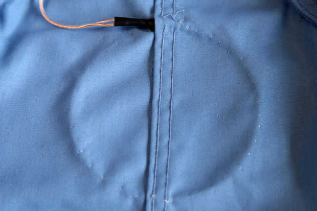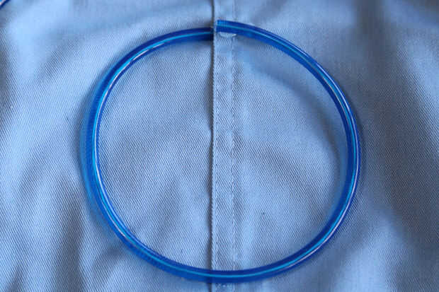 Coser el círculo era un poco más difícil que las otras líneas rectas en su mayoría de costura. Cortar la costura abierta y me pega EL alambre en su lugar antes de hacer cualquier costura. Os pongo dos pequeños toques de pegamento en la parte superior e inferior del círculo, para mantener en forma. La brecha en la costura sujeta el trozo de cable "volver". Luego cosí el círculo todo normalmente.
