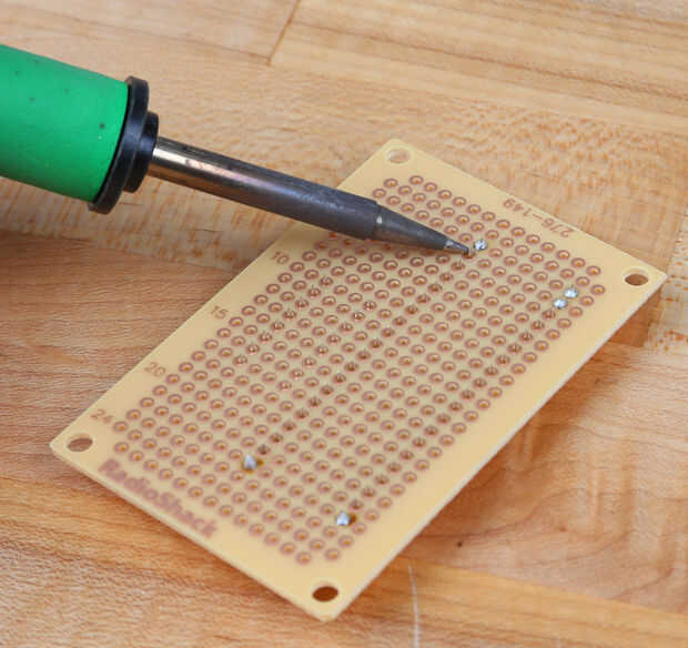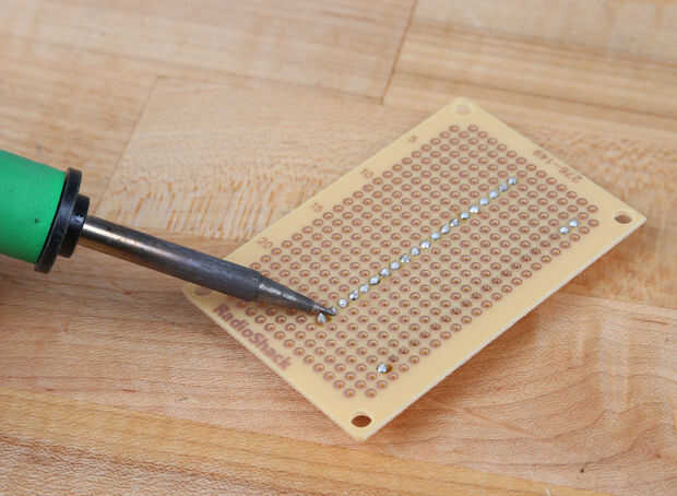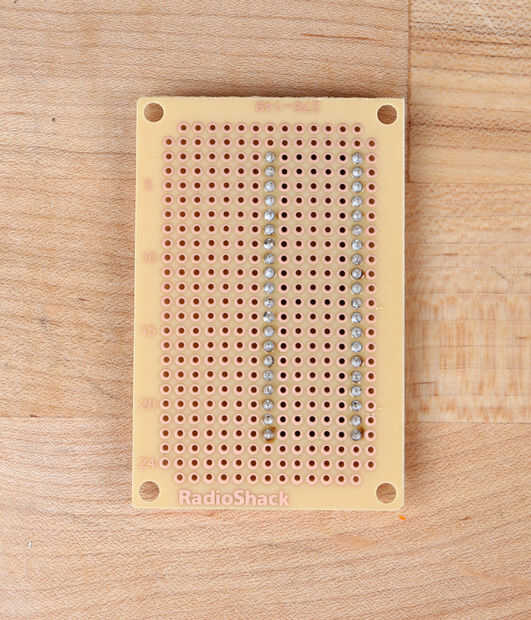 No tengo un enchufe con el exacto número de pines para el micro de Arduino, pero uno con unos extra filas funciona igual de bien. Empecé por las cuatro esquinas, para evitar que la toma está torcido de soldadura. Luego que soldados por cada fila. Asegúrese de obtener una conexión segura alrededor de cada perno.