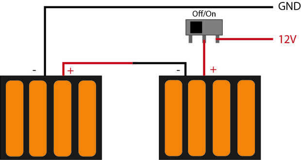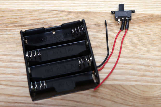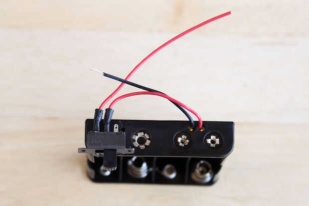 En este punto, me soldó el interruptor de encendido a la energía y caliente lo había pegado a la batería. (esto sería mucho más difícil hacerlo después de que las baterías están en los bolsillos del traje) El limpiaparabrisas (pin central) se conecta a los 12V que viene directamente de las baterías y el otro pin es el poder del circuito. El perno pasado que dejé abierto.