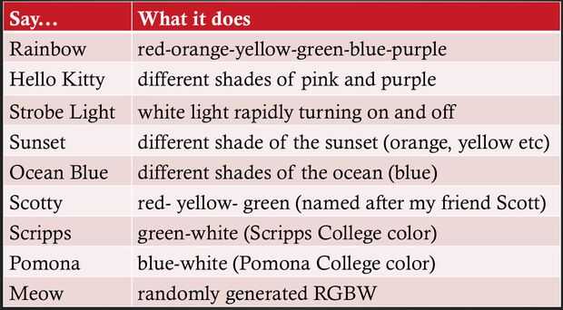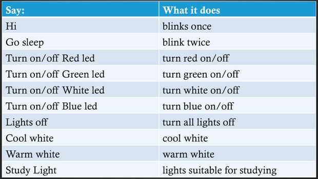 En las fotos anteriores, yo tengo los comandos y lo que hace el LED cuando escucha los comandos. El cuadro azul tiene comandos simples como despertar, activar/desactivar mientras que el cuadro rojo dispone de comandos que llama a patrones.