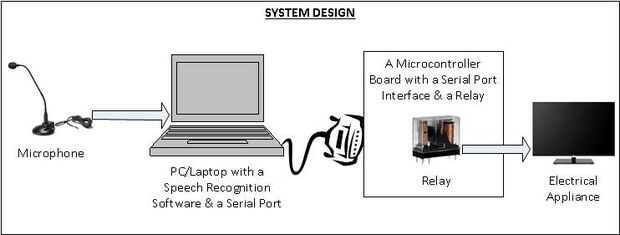 Este automatismo está diseñado y funciona es como se muestra en la figura. Cuando un comando de voz (los comandos de voz que me gusta) es pronunciado, es reconocido por un software de reconocimiento de voz funcionando en un PC con un micrófono. El software de reconocimiento de voz luego invoca a un programa de 'C', es decir Serial port driver, que envía un comando sobre la PC puerto serie a la cual está interconectado un tablero de micro-controlador. El microcontrolador en el tablero funciona un firmware que recibe el comando del puerto serial y lo interpreta. Continuación, el microcontrolador activa un pin de salida que conduce un transistor que a su vez acciona un relé. El relé entonces controla cualquier aparato conectado a él. La figura muestra el diseño del sistema completo.