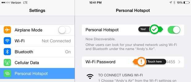 Ahora que el punto de acceso esté encendido, vamos a conseguirlo para que al conectarse al punto de acceso es más fácil para usted u otros que se conectan a él. En el menú de la derecha, justo debajo del botón que acaba de cumplir, debe ver una opción de contraseña de Wi-fi. Vamos a cambiar la contraseña tocando.