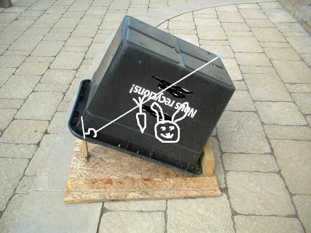 Esto es básicamente la vieja trampa de la moda de cebo-cadena-palo de caja, pero con un par de modificaciones para facilitar el viaje. El cebo está ligado a la media de la cadena, no el fin, esto da alguna ventaja mecánica, una pequeña fuerza sobre el cebo crea una fuerza mayor en los extremos de la cadena. Y el apoyo sosteniendo la caja se abisagra en el medio, así que no hay ninguna fricción deslizante para evitar el apoyo de liberación. Como resultado de ello es casi imposible para el animal al tocar el cebo sin disparar la trampa.