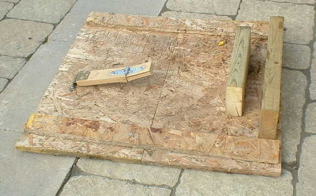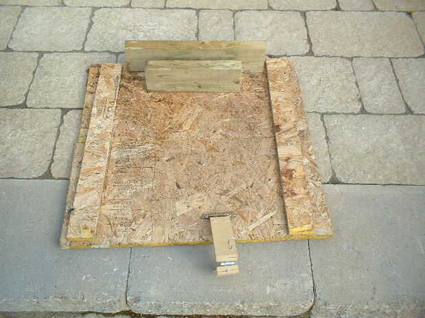 Hice mi base de 2 piezas de aglomerado que mentían alrededor en mi sótano. Tuve que atornillarlas junto con más piezas de aglomerado, pero que salió bien porque las piezas de aglomerado extra también funcionaban como rieles para mantener la caja en su lugar cuando el cuadro de abajo. Si tienes una sola pieza de madera contrachapada o aglomerado, puede que necesite fijar sobre rieles laterales, espaciados lo suficientemente lejos que el cuadro se ajusta libremente entre ellos. Piezas de 1 x 2 funciona muy bien.