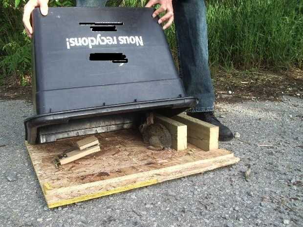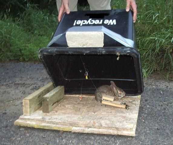 23 de julio de 2010 - finalmente atrapado conejo #3 (foto 4). En esta foto se puede ver que grabado algunos ladrillos a los lados de la caja para hacerlo más pesado. Un día encontré la trampa abajo pero ligeramente hacia fuera entre de los rieles y vacío, pensé que un conejo adulto podría quedó atrapado y fue lo suficientemente fuerte como para escapar, así que decidí hacer la caja más pesada.