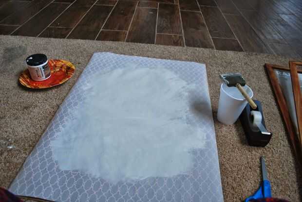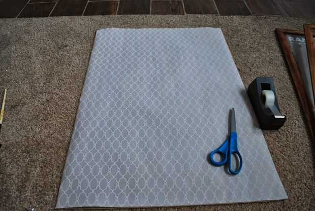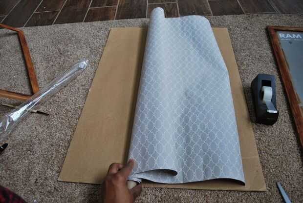 Estirar el papel sobre el respaldo de cartón que viene con el marco del embalaje de regalo.